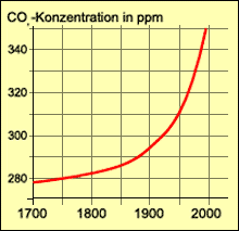 Pri izgorevanju 1 kg rjavega premoga nastanejo 4 kg CO2, pri 1 kg črnega premoga 3,3 kg,pri 1 l lahkega kurilnega olja 2,7 kg, celo pri okolju prijaznemu zemeljskemu plinu še vedno nastane 1,85 kg CO2 na m3. Vzrok za vedno večjo količino je povezava ogljika (C) in kisika (O) iz zraka. |